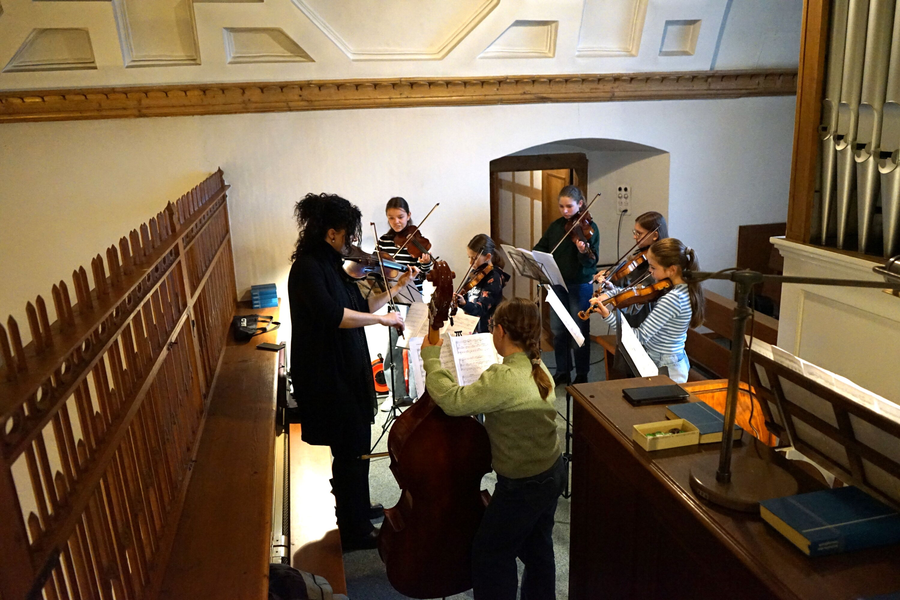 Die sechs Mädchen spielten unter der Leitung von Monica Tarcsay ein vielseitiges Programm mit bekannten Melodien aus verschiedenen Musikepochen: das klassische «Air» aus der Suite Nr. 3 von Johann Sebastian Bach fand sich darunter, aber auch das populäre «Greensleeves» und die «Andenmelodie». Einige Stücke wurden im Gesamtensemble gespielt, bei anderen hatten Solistinnen ihren Auftritt, so beim kraftvollen Violine-Concertino Op. 15 von Ferdinand Küchler. An der Orgel begleitete Christian Fritsche die Streicher und die Volksgesänge.